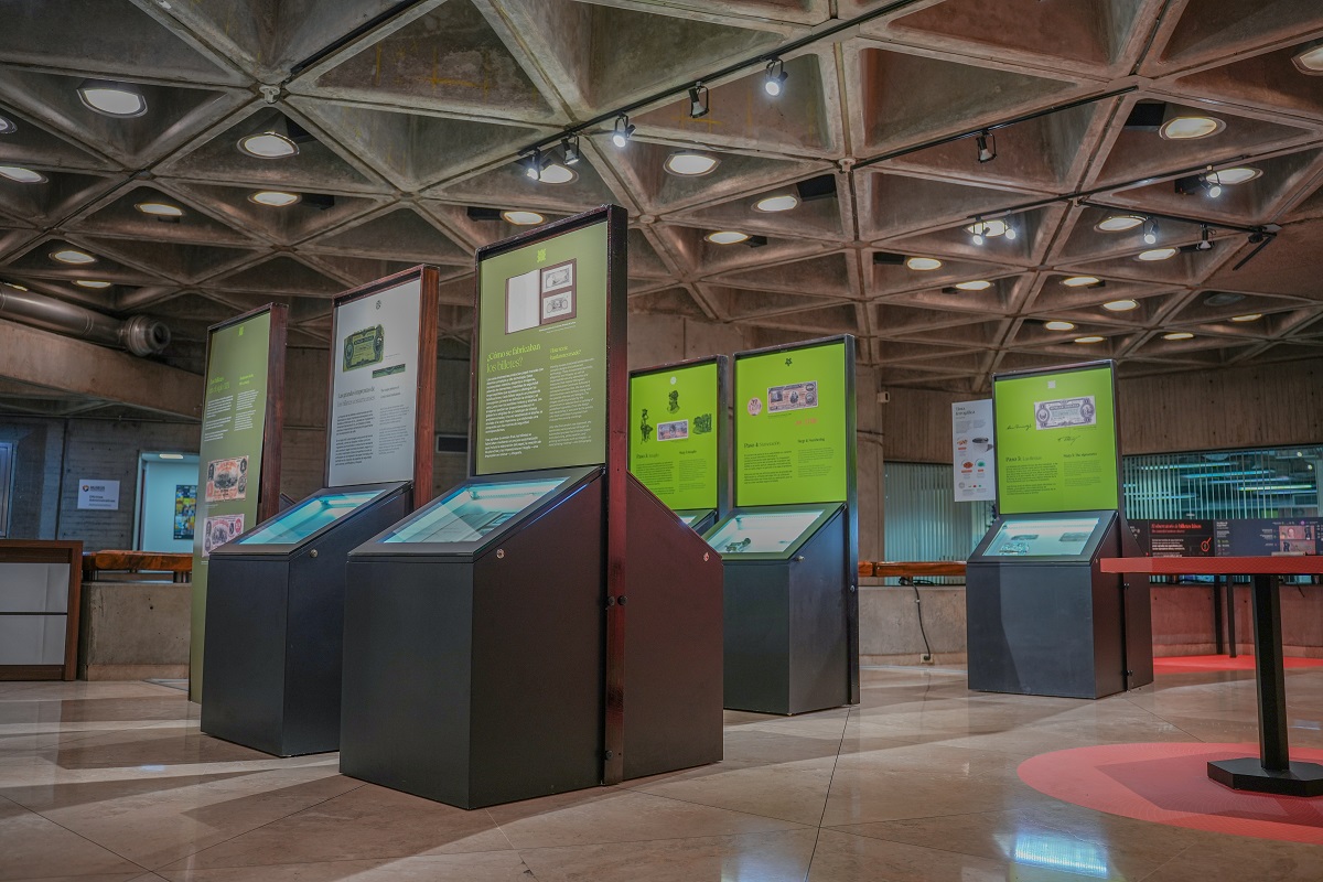 Una selección de billetes, detalles amplificados de sus diseños, placas de impresión, muestras de impresiones, tinteros y estaciones interactivas permitirán que quienes visiten la muestra se acerquen a la variedad de fibras que conformaron el papel de estos medios de pago, a las tintas que les dieron color, a tecnologías de impresión como el intaglio o la litografía y a las transformaciones de las medidas de seguridad de los billetes, entre otros pequeños pero significativos detalles que permitieron su circulación.